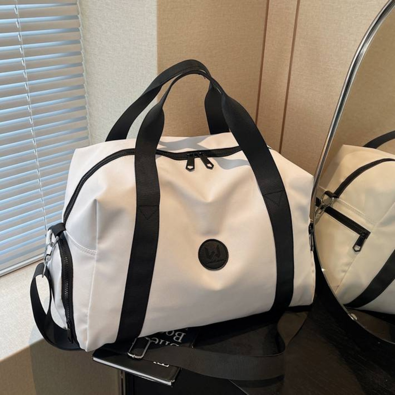 外ポケット・サイドポケット・シューズ収納スペース付きで、アイテムをしっかり分けて収納可能。シンプルながらも洗練されたバイカラーデザインは、性別問わずユニセックスで活躍。機能性とデザイン性を兼ね備えたアイテムです。