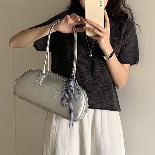 華やかな光沢感が目を引くシルバーカラーのショルダーバッグ。程よいコンパクトサイズでデイリーユースに最適ながらも、エレガントなシルエットがコーデのアクセントになります。可愛らしいチェックリボンがワンポイントになり、さりげない甘さを演出します。
