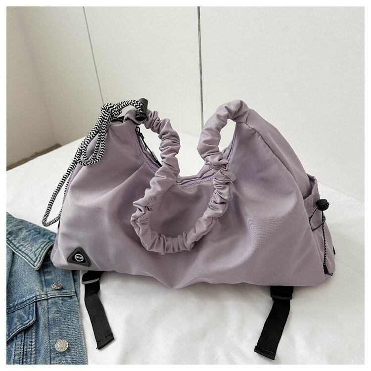 約0.3kgと超軽量ながら、見た目以上の収納力があり、財布・スマホ・コスメ・水筒など必要なものをしっかり収納可能。ドローストリング付きで開閉もスムーズ、さらにサイドポケットも便利で使い勝手抜群。フリル持ち手は肩掛けもラクで、長時間の使用でもストレスを感じさせません。