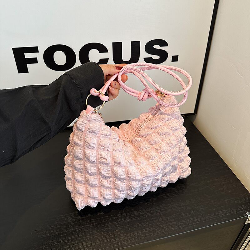 肌触り抜群のふわふわ生地が魅力のワンショルダーバッグ。表面は立体的な格子模様で、シンプルながら個性をプラス。カジュアルからフェミニンなコーデまで幅広くマッチする万能アイテムです。