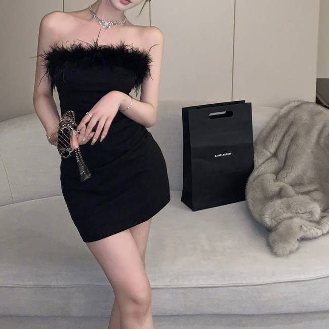 海外セレブ風のファッションを楽しみたい方や、トレンドを取り入れたい女性におすすめ。高級感のあるフェザーとタイトなシルエットの組み合わせで、特別な日の装いをさらに格上げしてくれます。