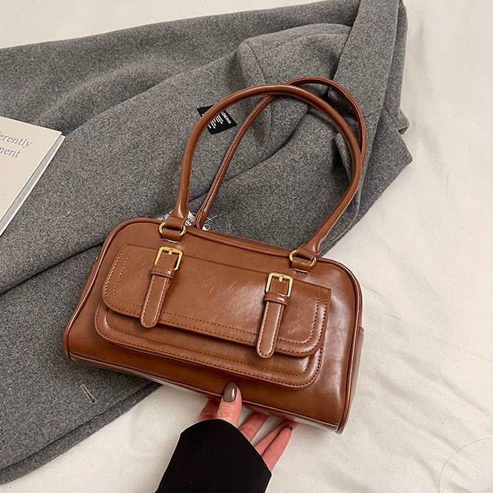 高級感のあるレザー調素材を使用したクラシカルなデザインのハンドバッグ。落ち着いた色合いと上品なシルエットで、大人カジュアルから通勤スタイルまで幅広く活躍。持ち手は肩掛けも可能な長さで、荷物が多い日も安心の収納力を兼ね備えています。