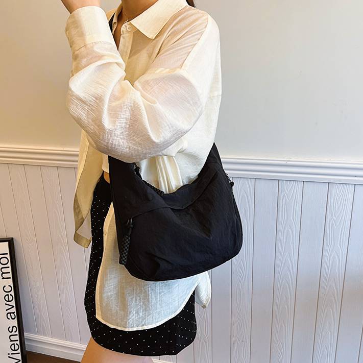軽量で持ちやすいデザインが魅力のショルダーバッグ。大容量でしっかり収納できるのに、すっきりとしたシルエットでコーデに合わせやすいアイテムです。シンプルながらもトレンド感のあるデザインで、普段使いから旅行まで幅広く活躍します。