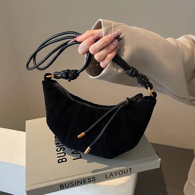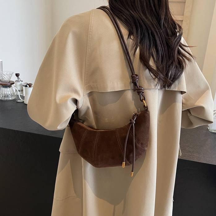ミニマルながらも洗練された印象を与える、今季トレンドの三日月型ショルダーバッグ