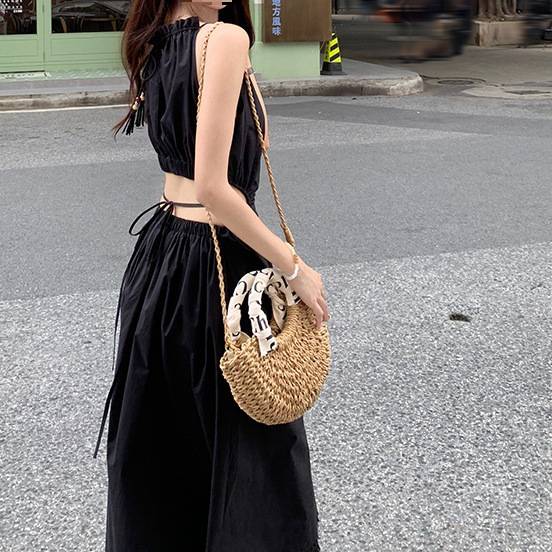 ① 夏のリゾートシーンでは、アイボリーカラーにラフィア素材のバッグやサンダルを合わせてナチュラルな雰囲気に。ビーチリゾートや旅行にも映える爽やかコーデになります。