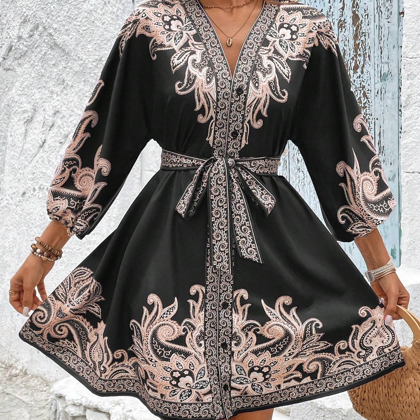 エレガントなエスニック調プリントが魅力のVネックワンピースです。胸元から裾にかけて流れるようなデザインは、女性らしいシルエットを美しく演出。切り替えラインがウエストを引き締め、スタイルアップ効果も期待できます。普段のお出かけから旅行、リゾートまで幅広く活躍するアイテムです。