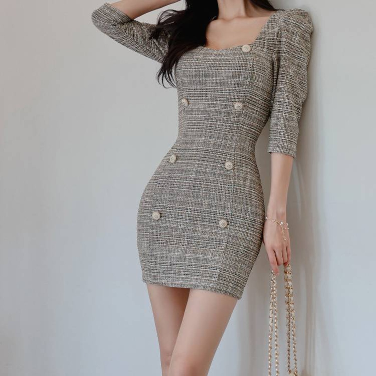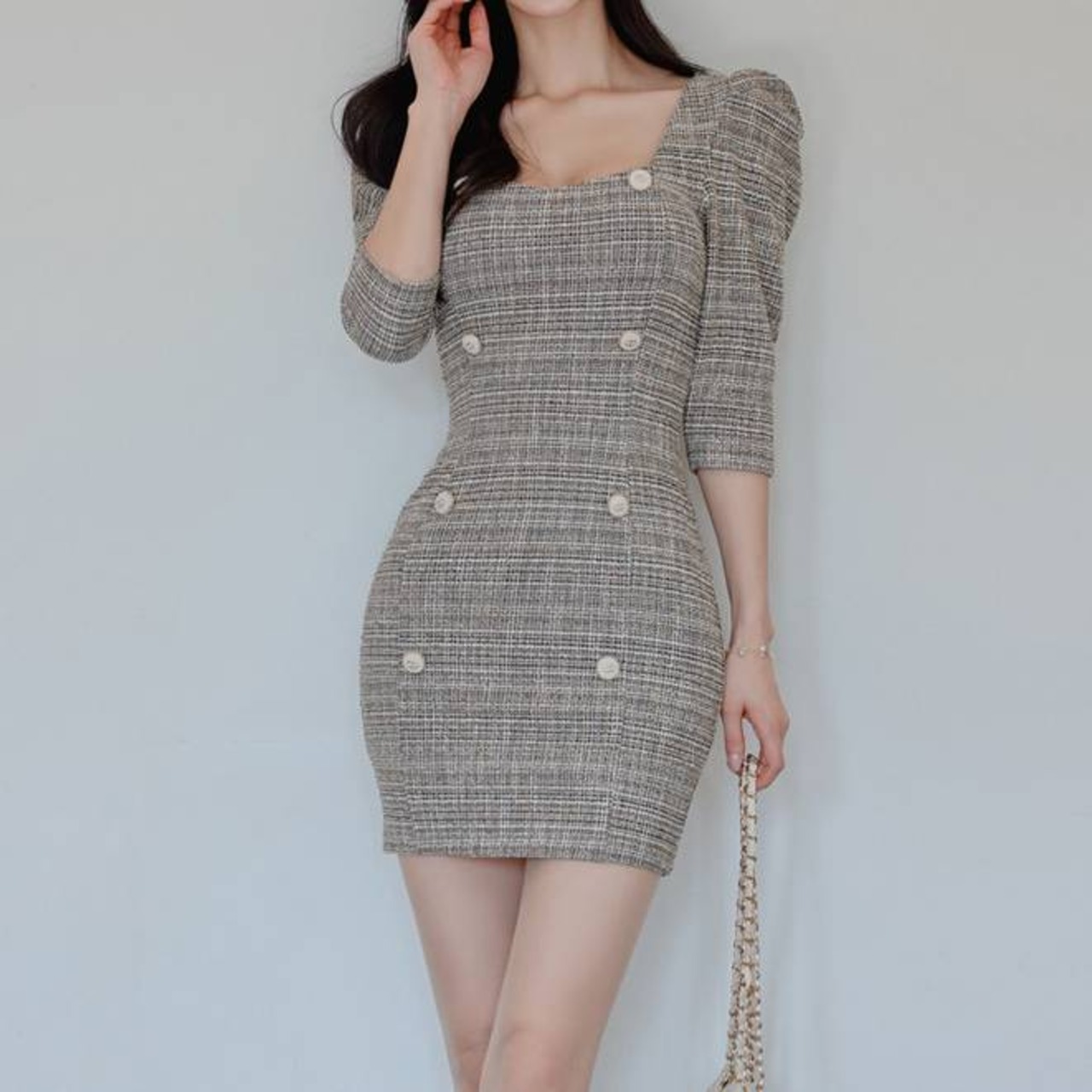 ツイード ワンピース タイト ミニワンピース レディース 長袖 五分袖 スクエアネック 韓国風 きれいめ 上品 パールボタン セクシー エレガント お呼ばれ デート 二次会 結婚式 通勤 通学 春 夏 秋 冬 20代 30代 40代 大人可愛い フェミニン おしゃれ 人気 トレンド 体型カバー グレー C-OSS0135