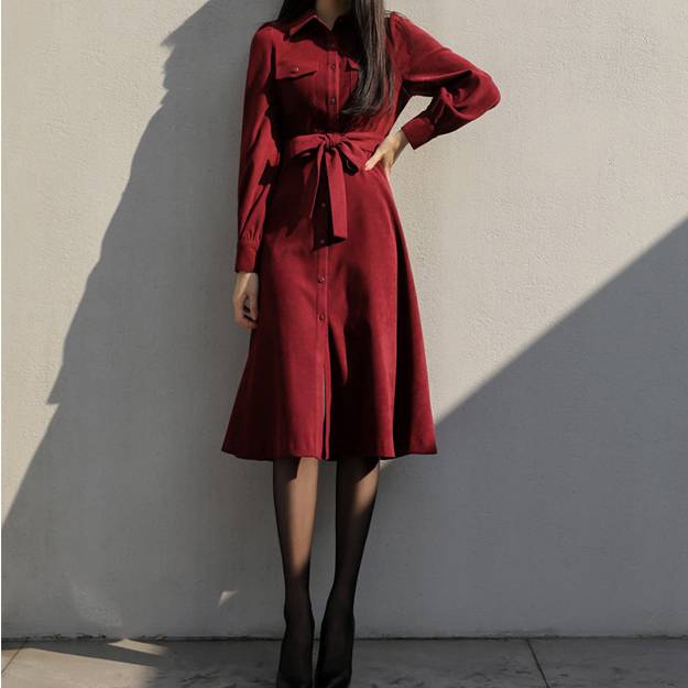 ベルト付き シャツワンピース ミディ丈 長袖 レディース きれいめ 上品 シンプル 無地 フレアワンピース 大人可愛い 韓国風 オフィス 通勤 通学 デート 秋冬 春 着痩せ 美シルエット ベルトリボン ウエストマーク エレガント フォーマル カジュアル ネイビー ボルドー おしゃれ 人気 20代 30代 40代 女性向け ファッション C-OSS0133