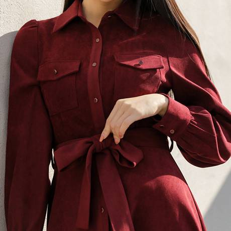 クラシカルで上品な印象を与える、ベルト付きの長袖シャツワンピース。
