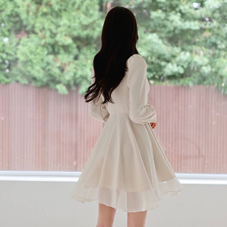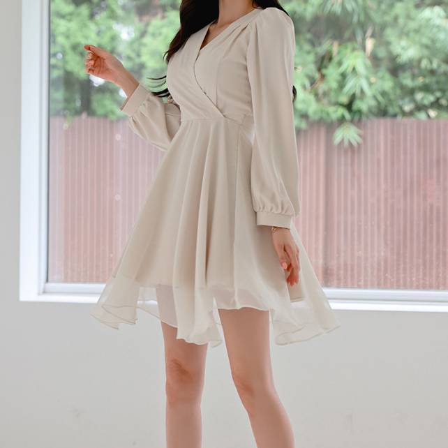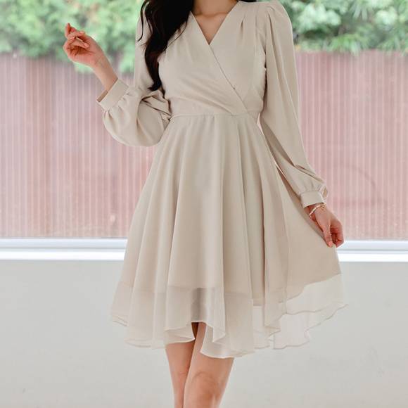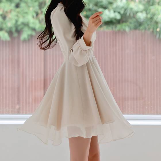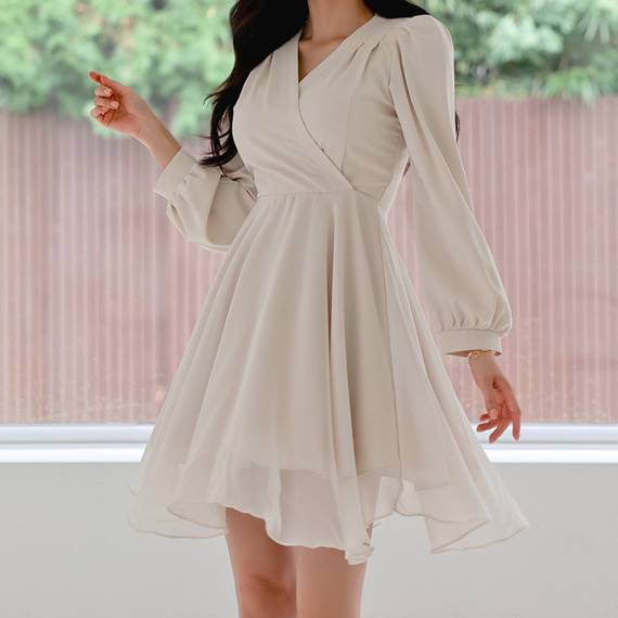 シフォン ワンピース フレアワンピース Aライン 長袖 レディース ミニ丈 ひざ上丈 きれいめ 上品 大人可愛い 清楚 韓国風 通勤 通学 デート お呼ばれ 結婚式 二次会 春 夏 秋 冬 20代 30代 40代 女性向け 人気 トレンド フェミニン ナチュラル 体型カバー エレガント ベージュ おしゃれ ファッション C-OSS0131