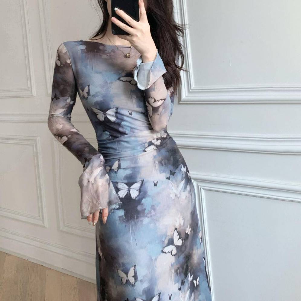 バタフライプリント ワンピース マキシ丈 ロングワンピース タイトワンピース レディース 長袖 透け感 セクシー エレガント きれいめ 韓国風 ブルー 蝶柄 おしゃれ 春 夏 秋 冬 大人可愛い 上品 人気 トレンド 20代 30代 40代 女性向け デート お呼ばれ フォーマル パーティー スタイリッシュ 体型カバー C-OSS0132