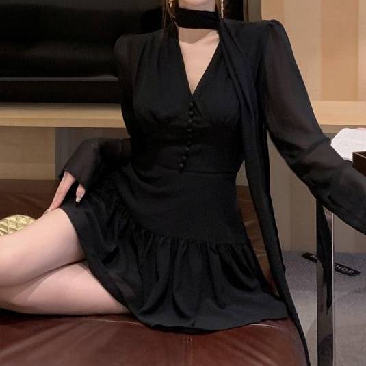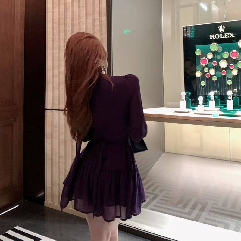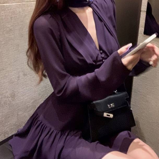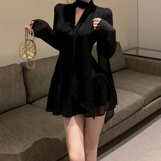 ワンピース レディース 長袖 ミニワンピース フレア Aライン リボンタイ シフォン 上品 きれいめ 韓国風 美脚効果 セクシー 可愛い エレガント 透け感 パーティー お呼ばれ デート ナイトドレス 春 夏 秋 冬 20代 30代 40代 人気 ブラック パープル C-OSS0157