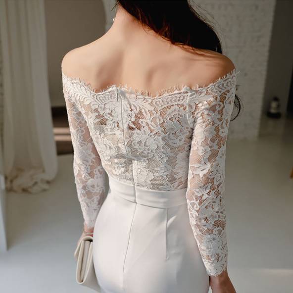肩を優雅に見せるデザインと繊細なレースがフェミニンさを引き立てます。