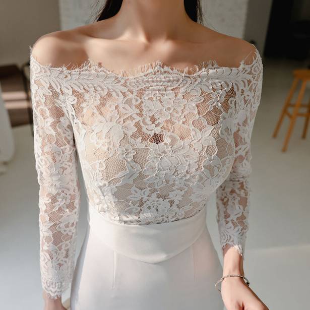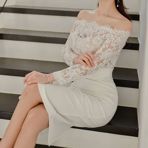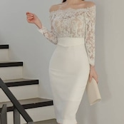 上品なレースとタイトなシルエットが美しい、オフショルダーのレースワンピース。