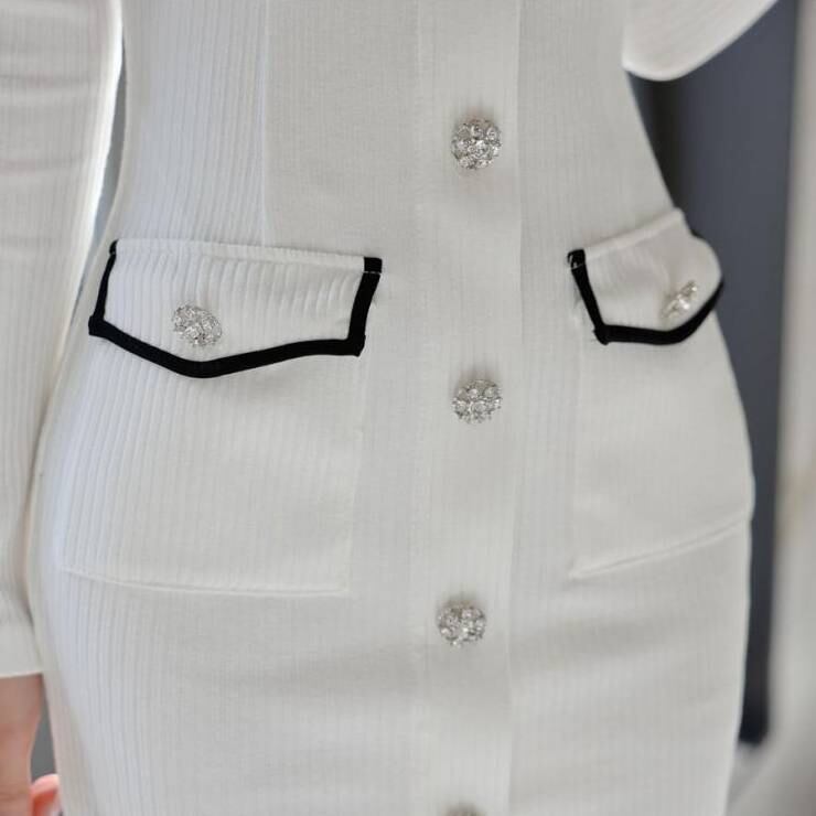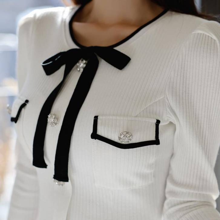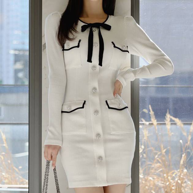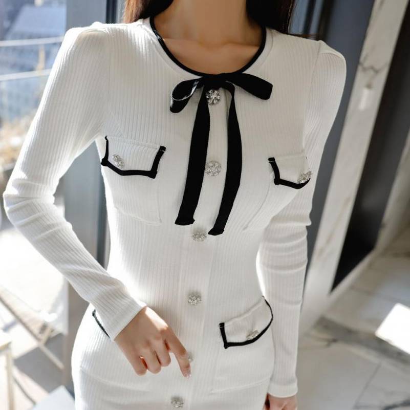 リボン付き ニット ワンピース タイト レディース ミニ丈 長袖 上品 きれいめ 韓国風 ワンピース 春 秋 冬 ブラックライン ボタンデザイン エレガント フェミニン ストレッチ 着痩せ 清楚 通勤 デート 20代 30代 40代 美シルエット モノトーン おしゃれ 人気 高見え ホワイト C-OSS0141