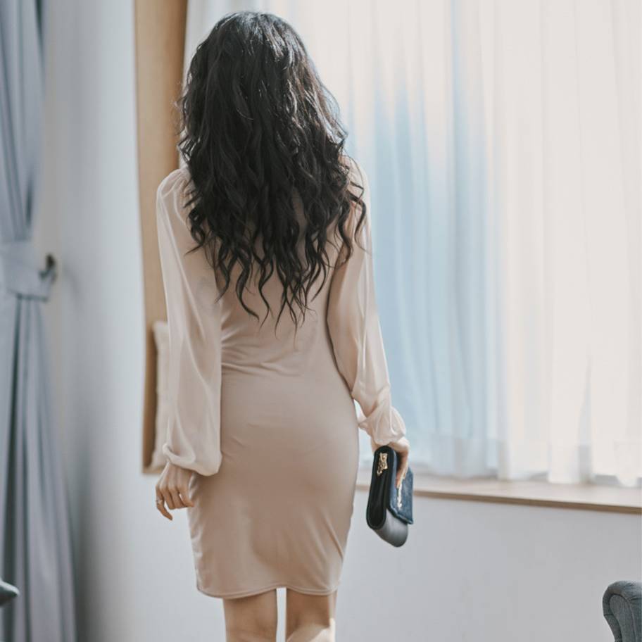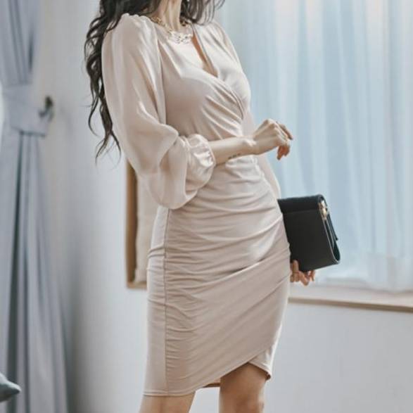 シフォン スリーブ ワンピース タイト ドレープデザイン Vネック レディース 長袖 エレガント 韓国風 上品 お呼ばれ きれいめ 春 夏 秋 冬 体型カバー デート 通勤 二次会 フォーマル おしゃれ 大人フェミニン 20代 30代 40代 高見え カーキ ベージュ風カラー パーティードレス トレンド 人気 C-OSS0137
