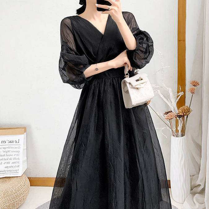 ロングワンピース レディース シースルー Aライン 体型カバー Vネック 長袖 ふんわり袖 マキシ丈 ドレス シアーワンピース エレガント 大人可愛い ブラック パープル グリーン 韓国ファッション 春 夏 秋 冬 きれいめ 通勤 デート 二次会 発表会 同窓会 お呼ばれ 上品 大人コーデ S〜3XL対応 C-OSS0172