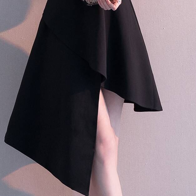 立体的なアシンメトリーヘムのスカートが上品な動きを演出し、歩くたびに軽やかな印象を与えます。