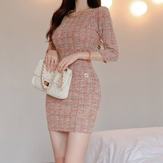 ワンピース レディース ツイード ミニワンピース 半袖 七分袖 タイト 上品 エレガント きれいめ フォーマル 韓国風 かわいい 高見え 大人可愛い チェーンネック 春 秋 冬 通勤 デート パーティー 二次会 結婚式 お呼ばれ 20代 30代 40代 人気 ピンク C-OSS0161