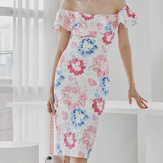 華やかなフラワープリントと女性らしいオフショルダーシルエットが魅力のタイトワンピース。