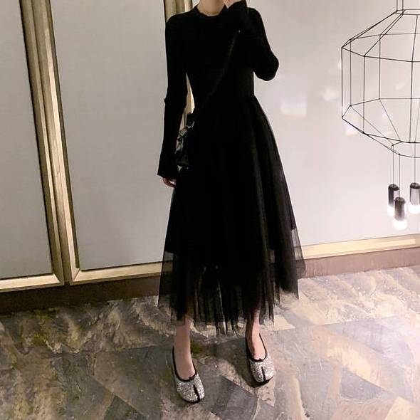 歩くたびにふんわりと揺れるチュールスカートが美しい、上品で落ち着いたブラックロングワンピース。シンプルな長袖トップスと軽やかな透け感チュールを合わせた異素材ミックスデザインで、大人の女性らしさを最大限に引き立てます。スタイルを綺麗に見せるウエスト位置の絶妙な切り替えが魅力で、細見え効果も抜群。
