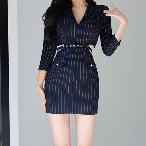 ネイビーブラック ワンピース レディース ミニワンピース タイトワンピース ストライプ 七分袖 ベルト付き 美シルエット スリム フォーマル エレガント セクシー 韓国ファッション 上品 大人可愛い デート パーティー 通勤 オフィス 春 夏 秋 冬 人気 トレンド C-OSS0215