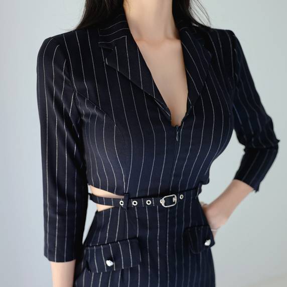 クラシカルなピンストライプ柄が魅力のタイトミニワンピース。