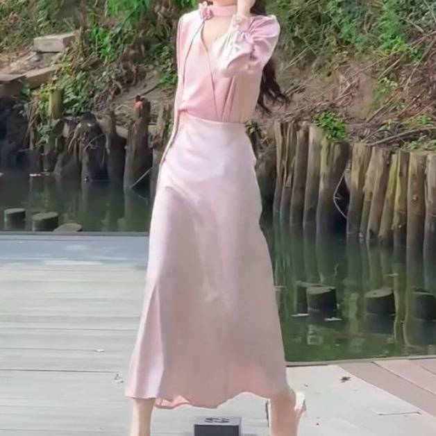華やかで上品な印象を与える、リボンタイ付きブラウスとサテンロングスカートを組み合わせたセットアップ風ワンピース。