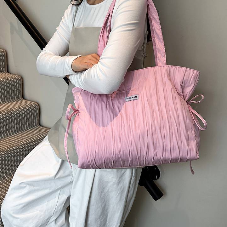 サイドのリボンデザインがさりげないアクセントになり、シンプルながらも女性らしさをプラス。ブラック・ピンク・オフホワイト・ホワイトの使いやすいカラー展開で、季節を問わず長く愛用できる万能トートバッグです。