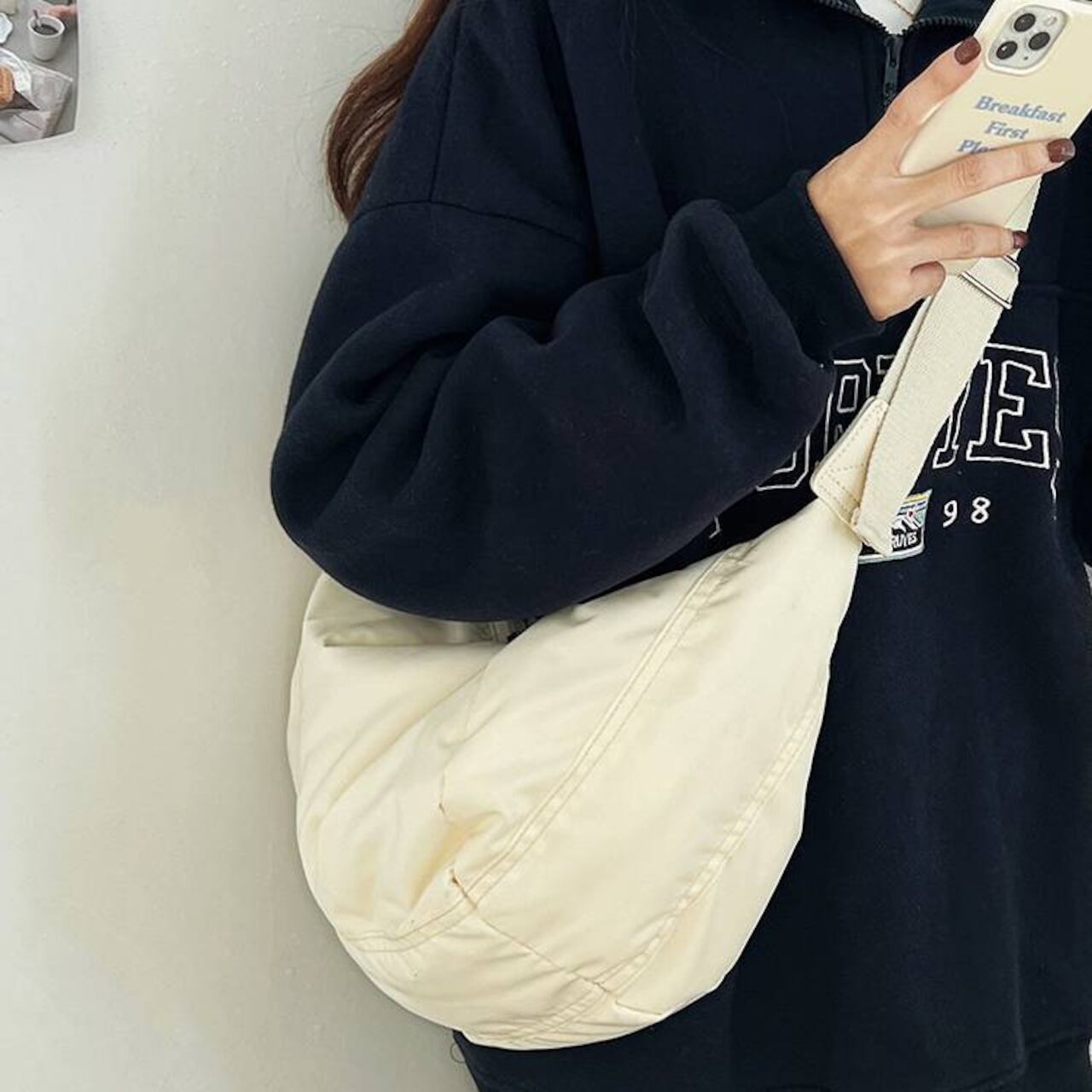 オーバーサイズのスウェットやパーカーに合わせれば、韓国風ストリートな雰囲気に。黒バッグなら締まりが出てスタイルアップ、白バッグなら抜け感が生まれて軽やかに仕上がります。