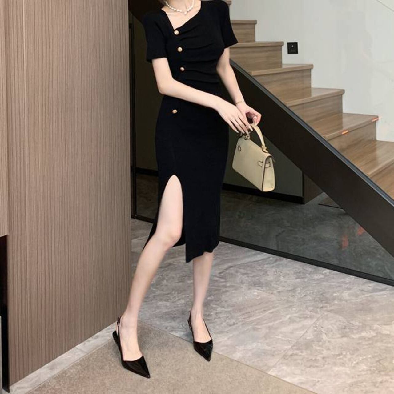 身体のラインを立体的に美しく魅せるタイト設計と、視覚効果を高めるアシンメトリーボタンを組み合わせた上品ワンピース。ブラックのワントーンは大人の落ち着きを演出しつつ、女性らしい色気も程よくプラス。ホテルディナーや二次会、デートなど特別な場面はもちろん、普段のきれいめコーデにも活躍します。
