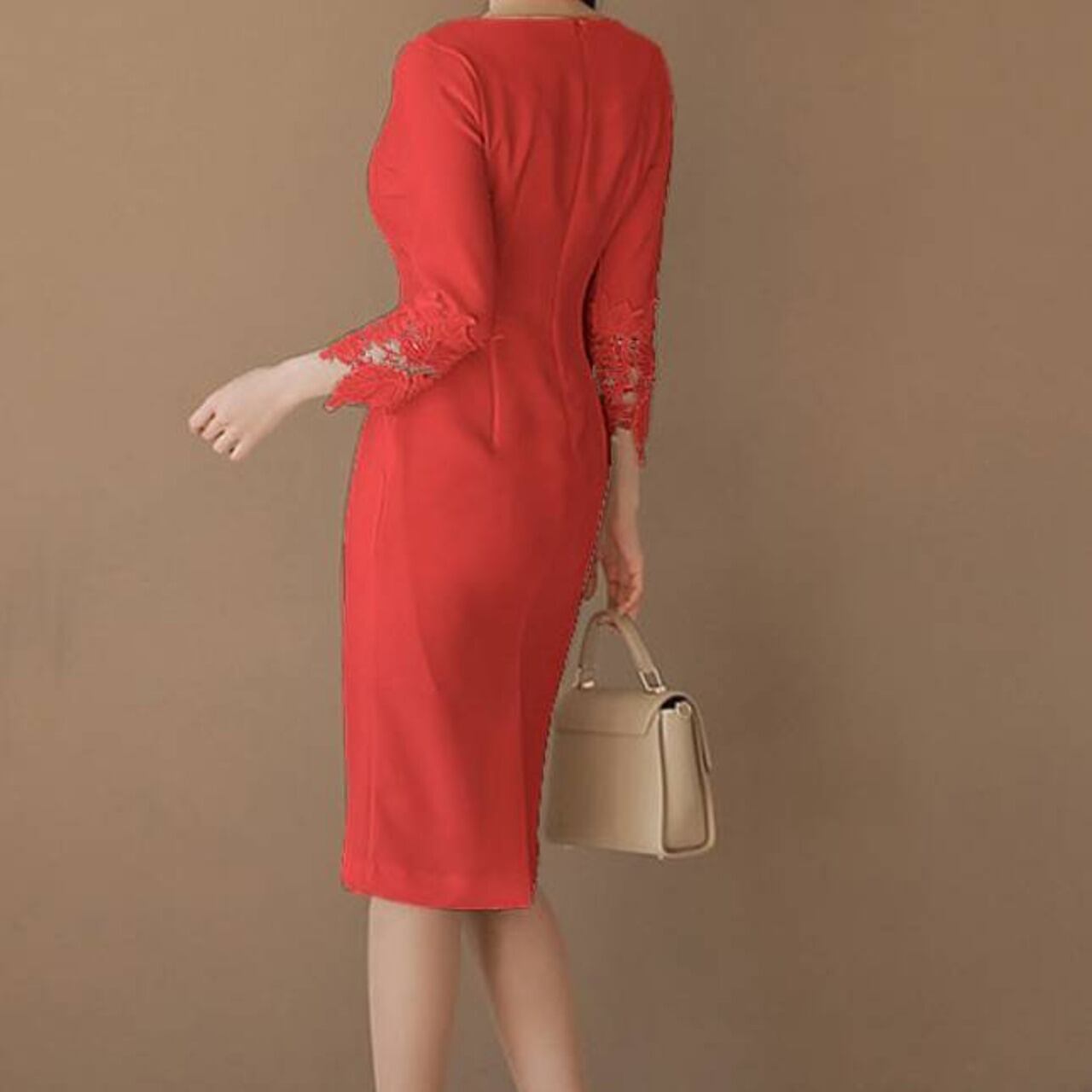 エレガンススリムライン ワンピース タイトワンピース 七分袖 レーススリーブ 体型補正 美ライン ブラック レッド ホワイト 上品 清楚 きれいめ 大人可愛い パーティー 結婚式 二次会 デート 通勤 韓国風 フォーマル シンプル 洗練デザイン ワンタイプ C-OSS0242