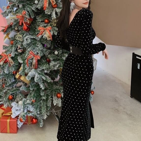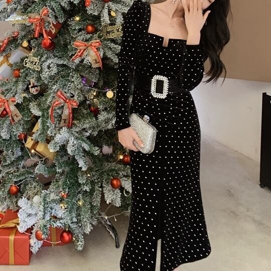 商品名:ドット柄パフスリーブ&スクエアネック ロングワンピース