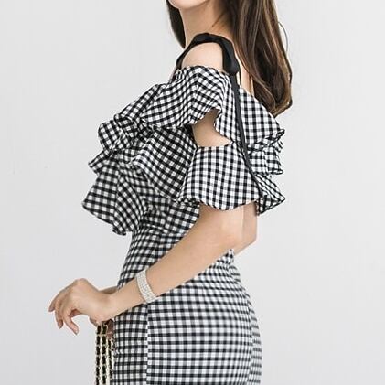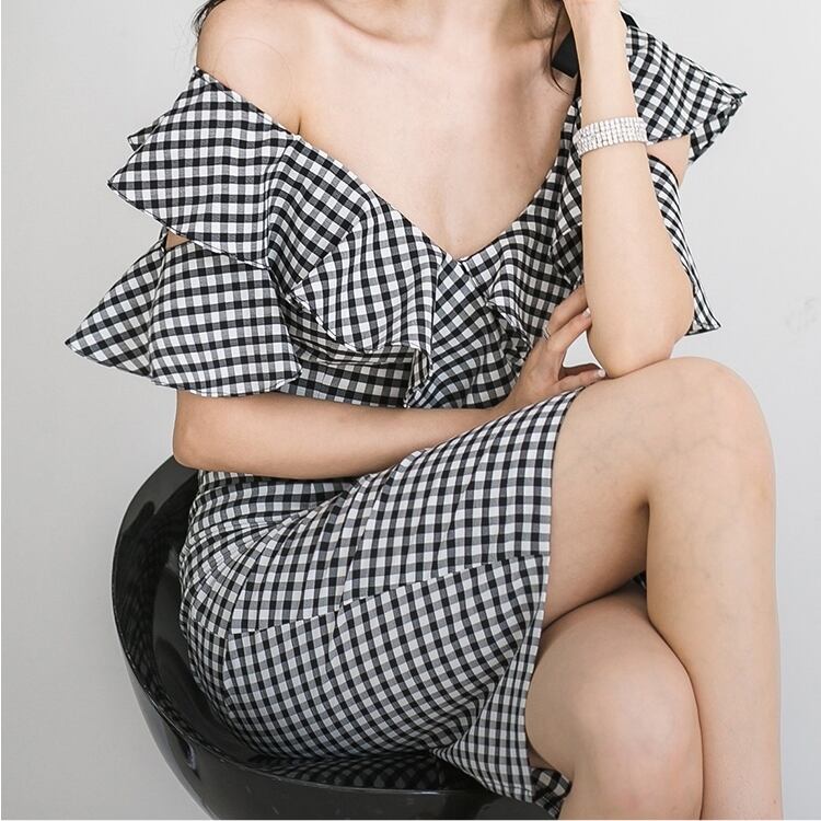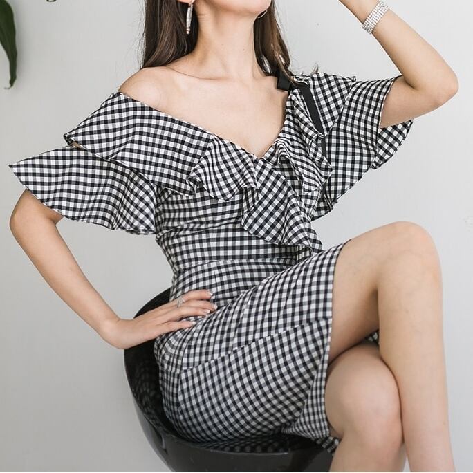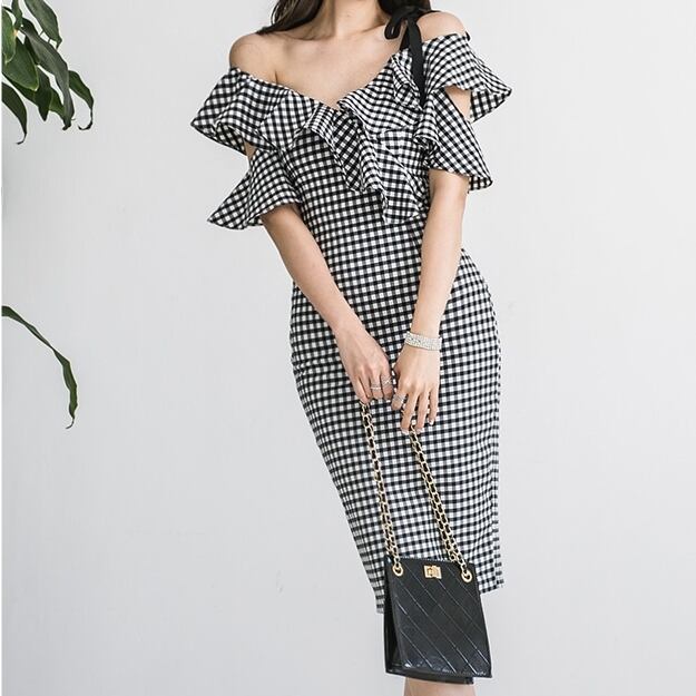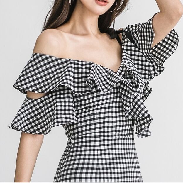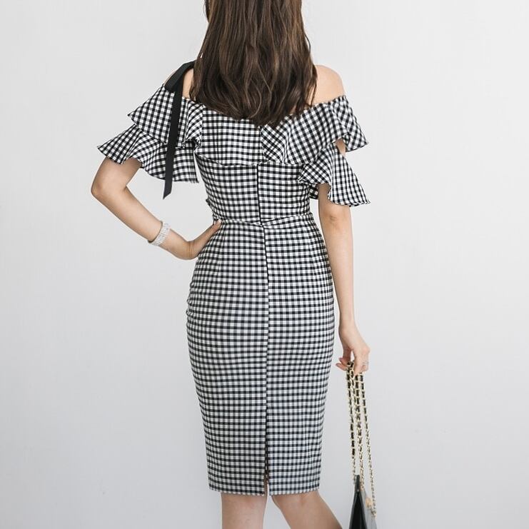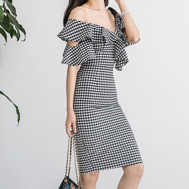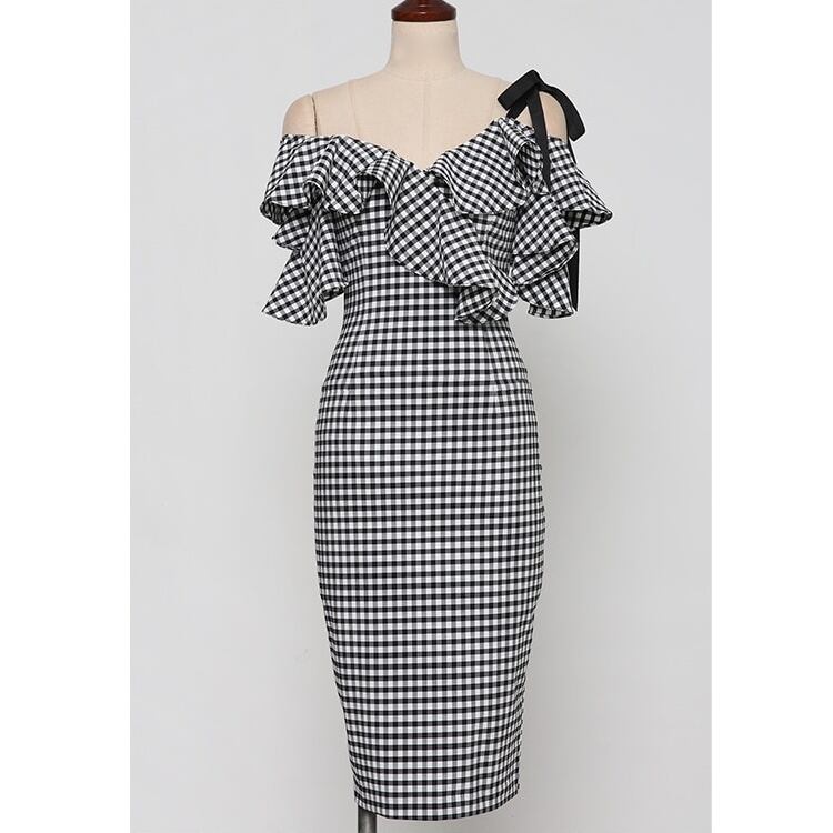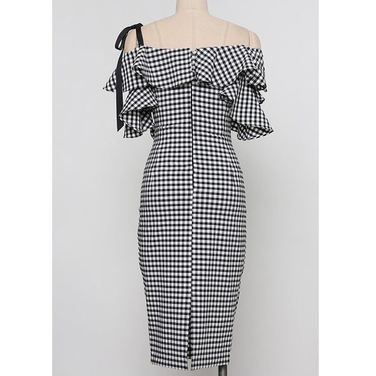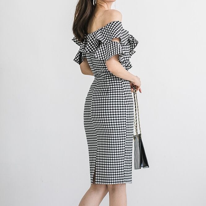 オフショルダー ギンガムチェック タイトワンピース C-OSS0005