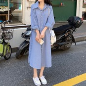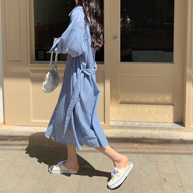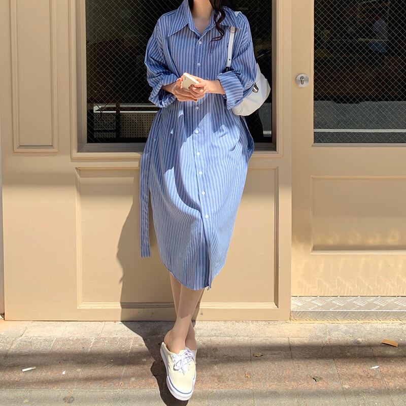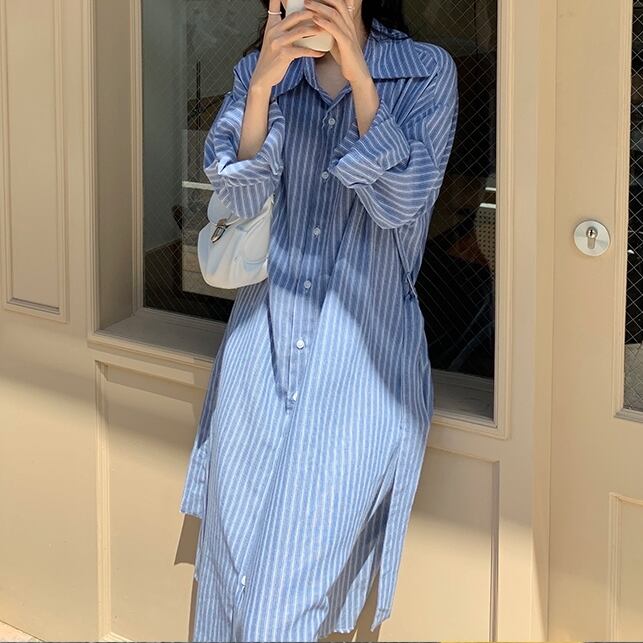 商品名:ウエストリボン ストライプ ロング シャツワンピース