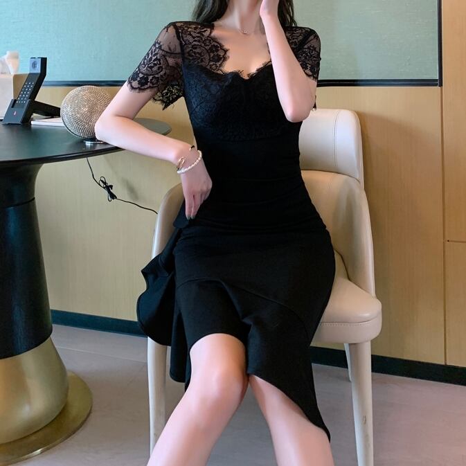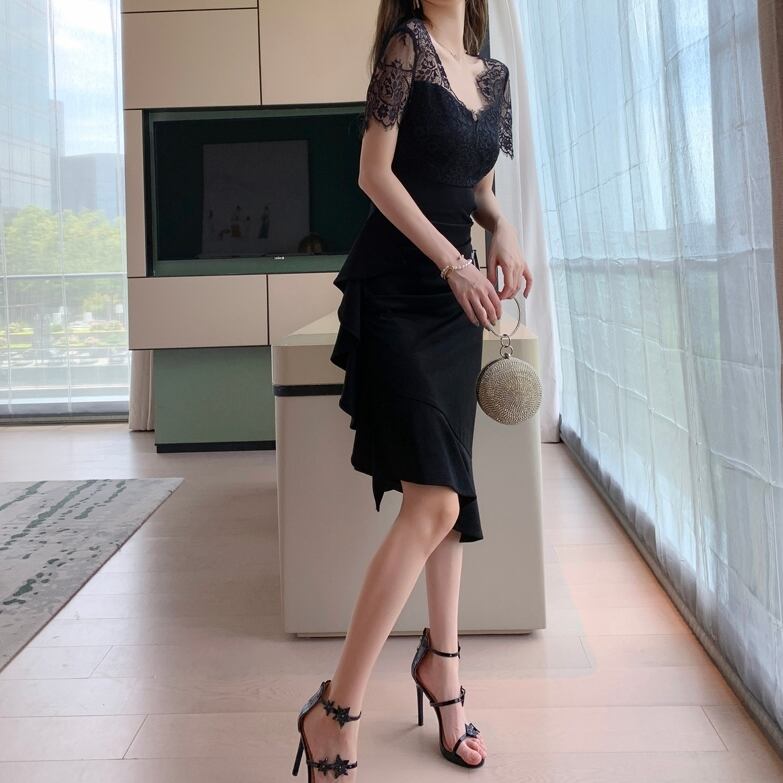 商品名:シースルー レース アシンメトリー タイト パーティードレス