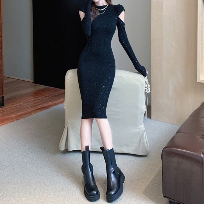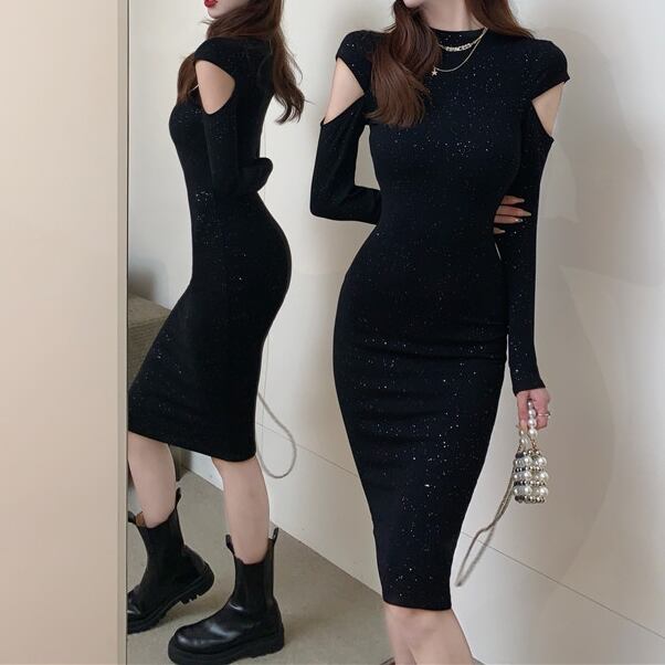 ワンピース ドレス レディース 春夏 秋冬 春 夏 秋 冬 黒 タイトワンピース タイトドレス 長袖 ワンピース ドレスワンピース ミディアムドレス ワンピース きれいめ 韓国 タイトワンピース ミモレドレス ひざ丈ワンピース ラメ シンプル オープンショルダー カットショルダー ワンピースドレス 韓国ファッション OL カジュアル オフィスカジュアル 結婚式 パーティー ブラック お呼ばれ シンプル 10代 20代 30代 40代 C-OSS0076