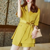ジャケットとショートパンツのパンツスーツ。