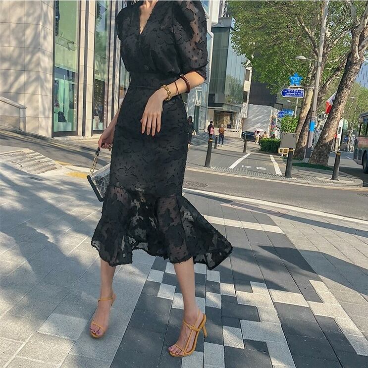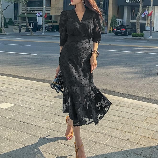 ワンピース レディース 春夏 秋冬 春 夏 秋 冬 黒 ミディアム丈ワンピース 5分袖 半袖 ドレス マーメイド レース ワンピースドレス Vネック ひざ丈 ひざ下 総レース パフスリーブ ドレスワンピース ミモレワンピース 半袖ワンピース シースルー お呼ばれ ロングワンピース 半袖 10代 20代 30代 40代 C-OSS0020