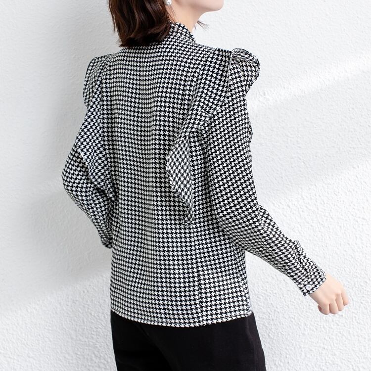 商品名:千鳥柄 フリル ボウタイ ブラウスシャツ
