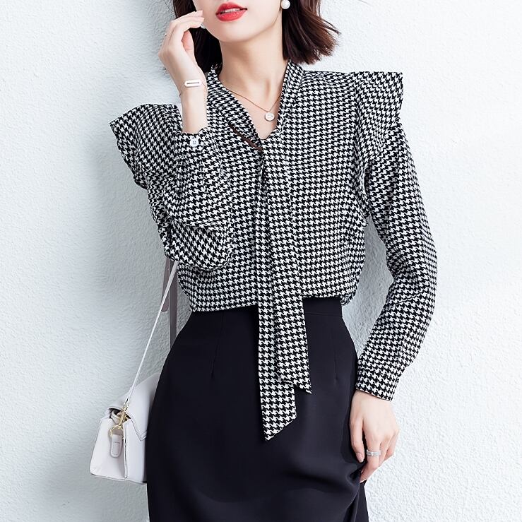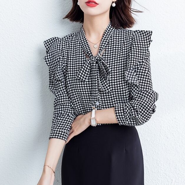 千鳥柄シャツ レディース 春夏 秋冬 春 夏 秋 冬 白 黒 ブラウス トップス 長袖 フリル 長袖トップス 千鳥柄シャツ トップス チュニック フリルブラウス 千鳥柄 ホワイト ブラック 千鳥柄ブラウス 韓国 ゆったり ボウタイシャツ ブラウスシャツ 体型カバー シンプル シャツブラウス オフィス カジュアル OL 上品 大人 10代 20代 30代 40代 C-TSS0054