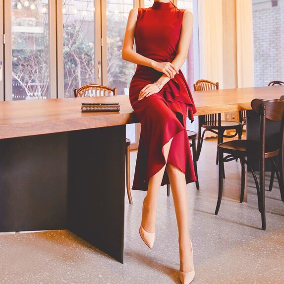 ワンピース レディース 春夏 秋冬 春 夏 秋 冬 黒 ドレス マーメイドワンピース ドレスワンピース フリル アシンメトリー ノースリーブ ハイネック パーティードレス 結婚式 パーティー お呼ばれ ブラック ワインレッド ボルドー 10代 20代 30代 40代 C-DSS1014