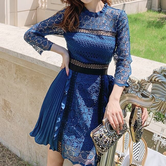 商品名:レース7分袖 プリーツ Aラインドレスワンピース