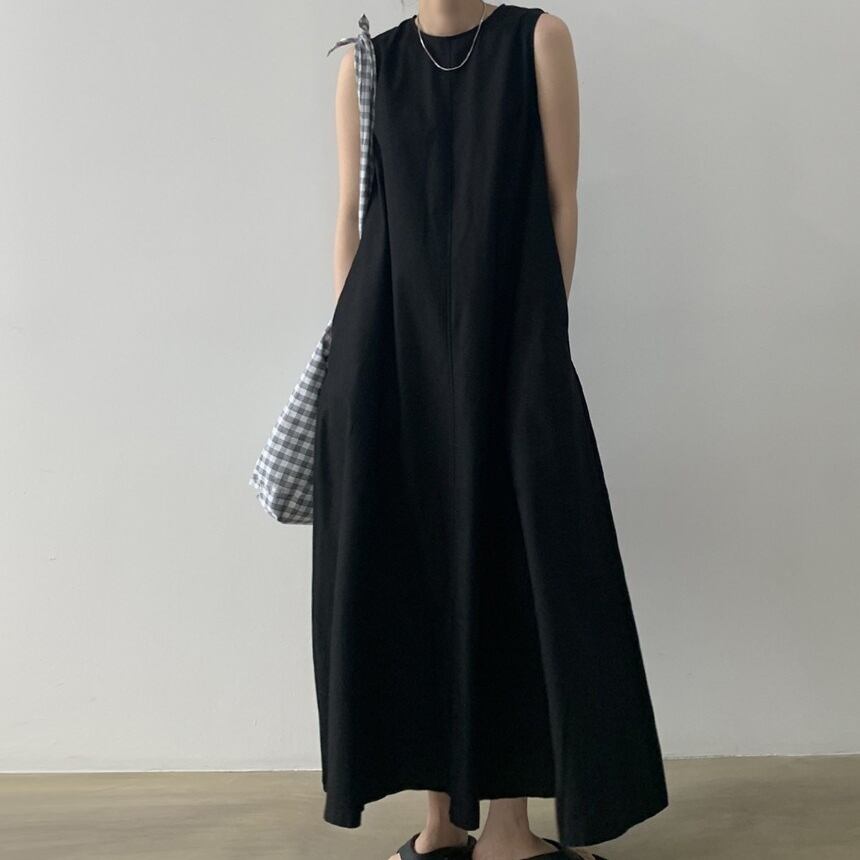 商品名:ラウンドネック ゆったりノースリーブ ロングワンピース
