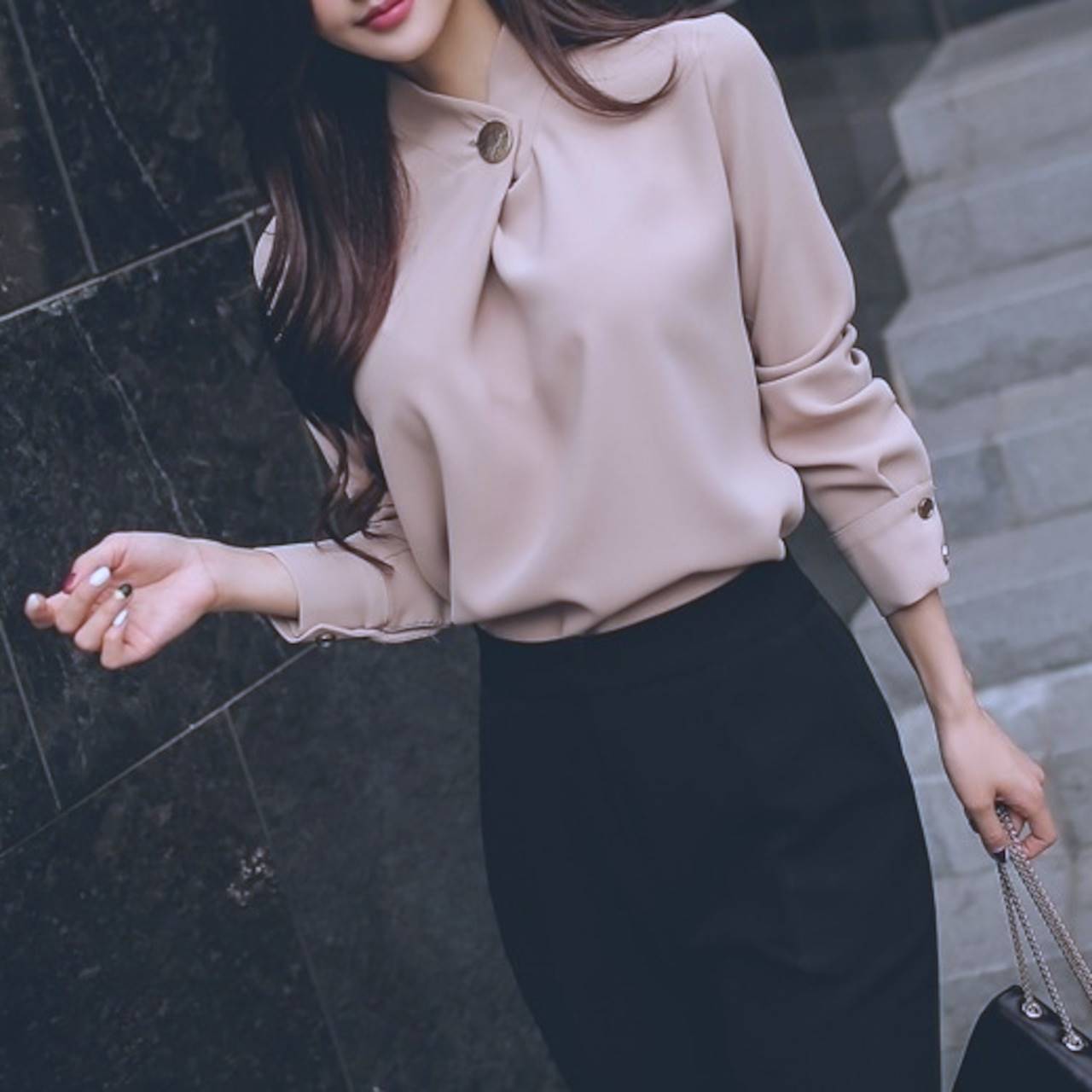 首元の大きめボタンがアクセントになって