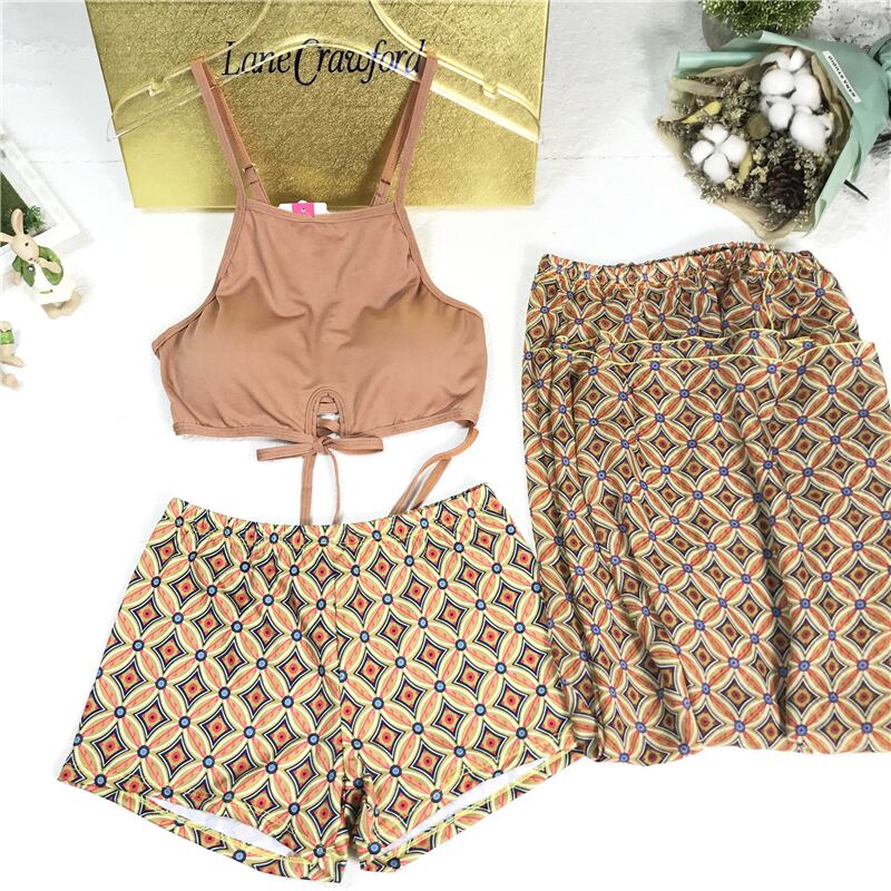 トップス、ショートパンツ、パレオの3点セット。