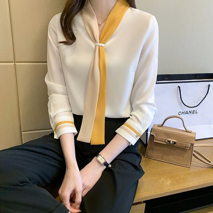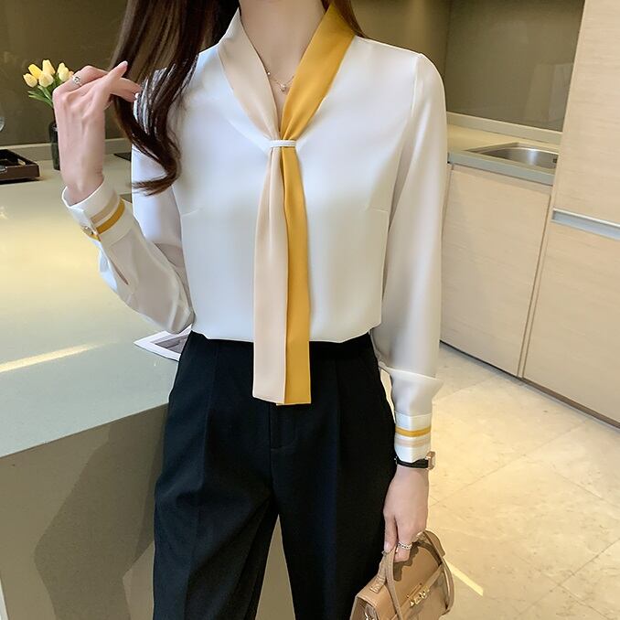 商品名:バイカラー ボウタイ 長袖 ブラウス シャツ